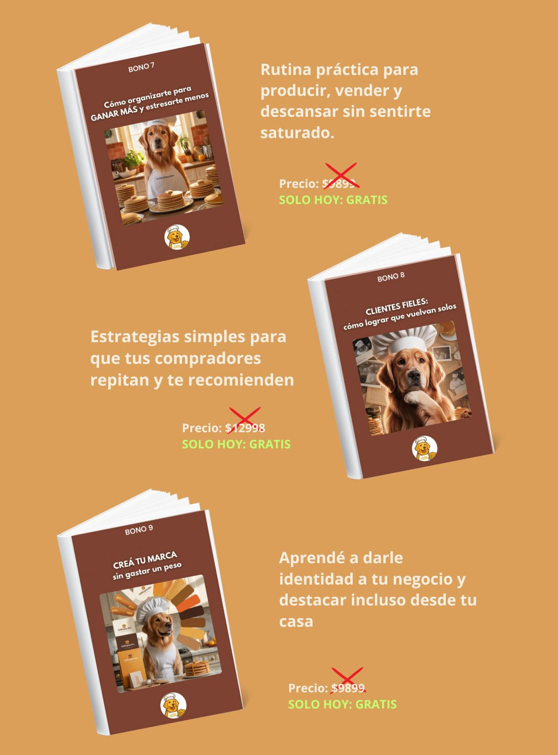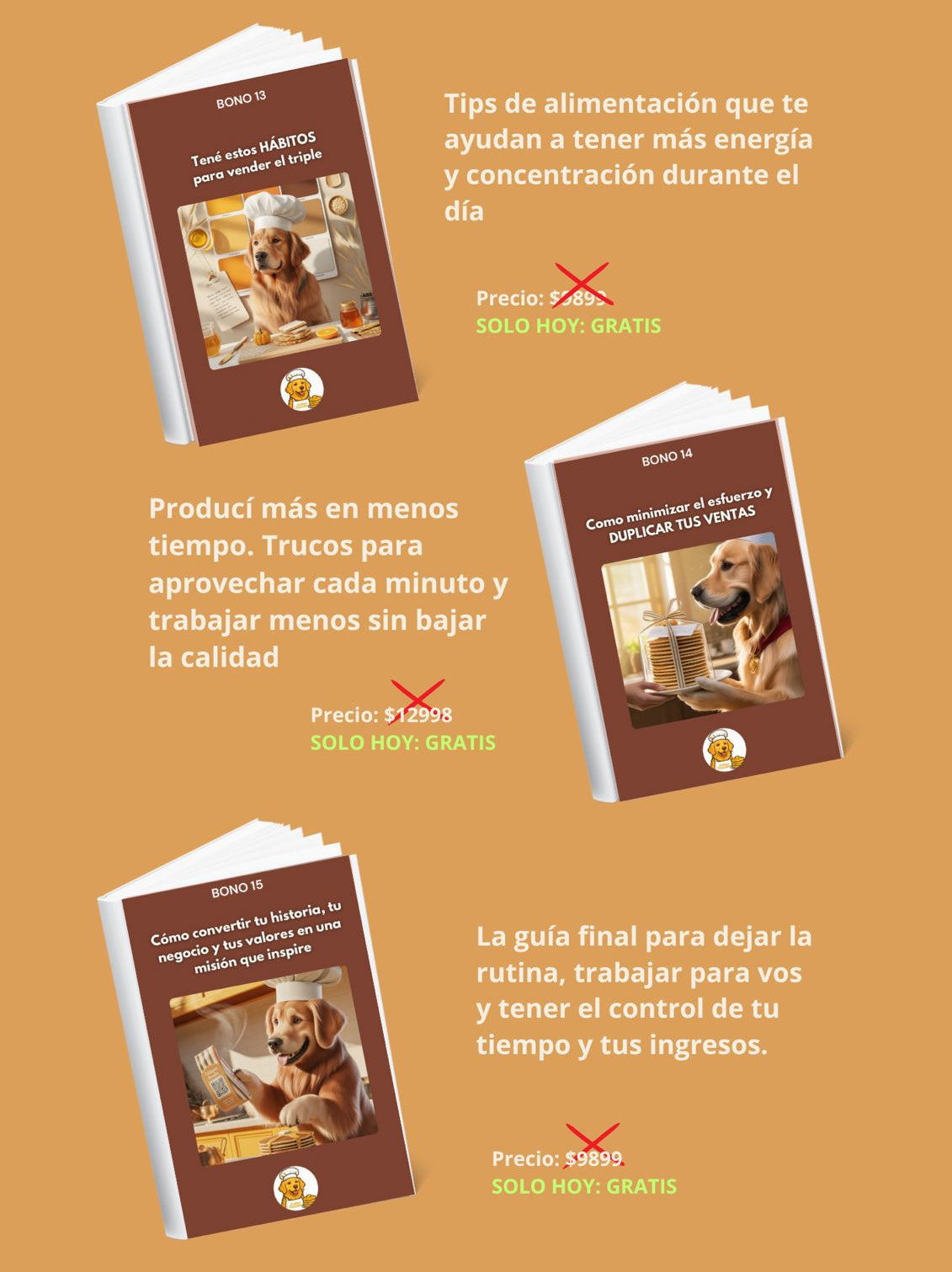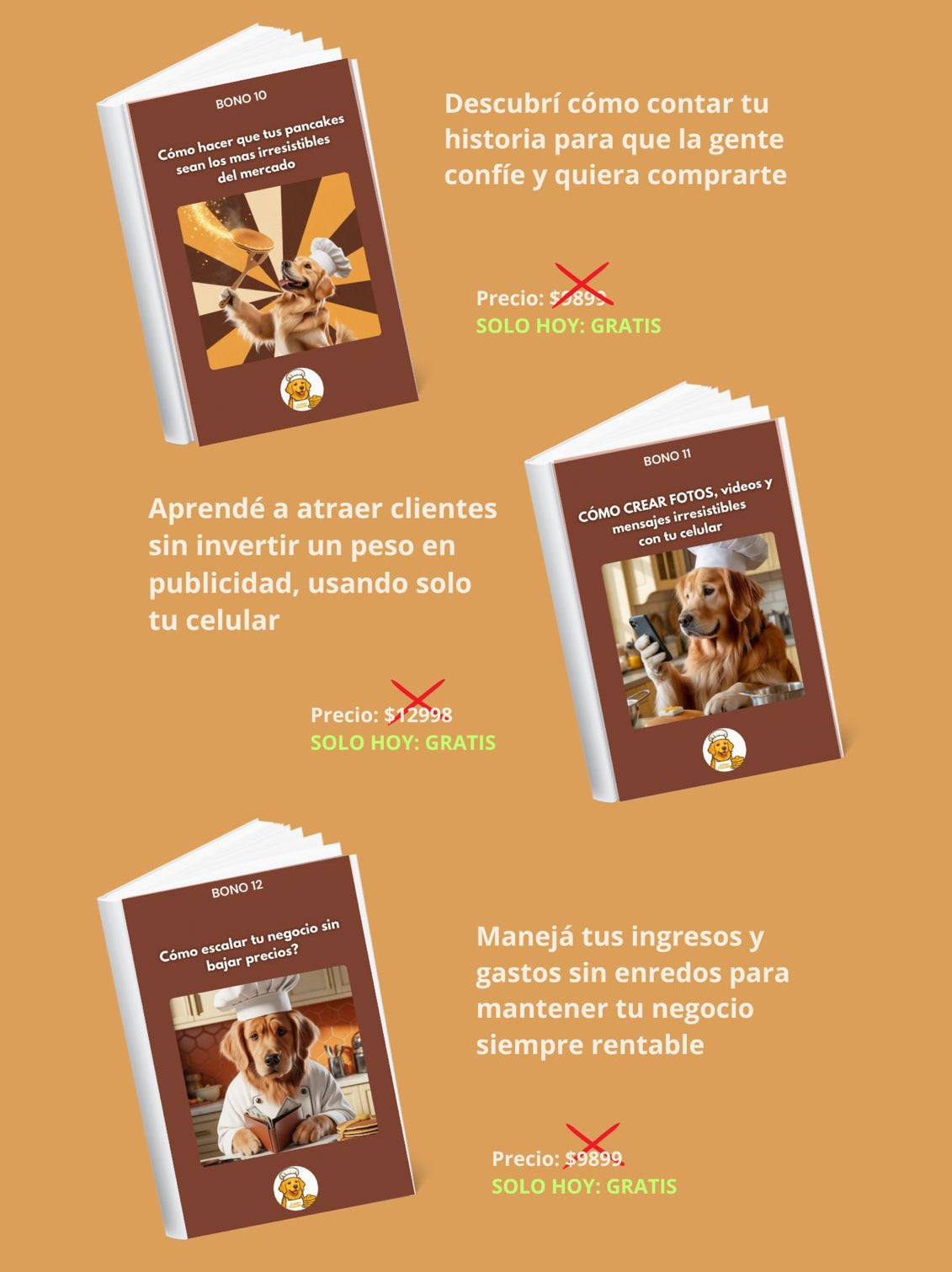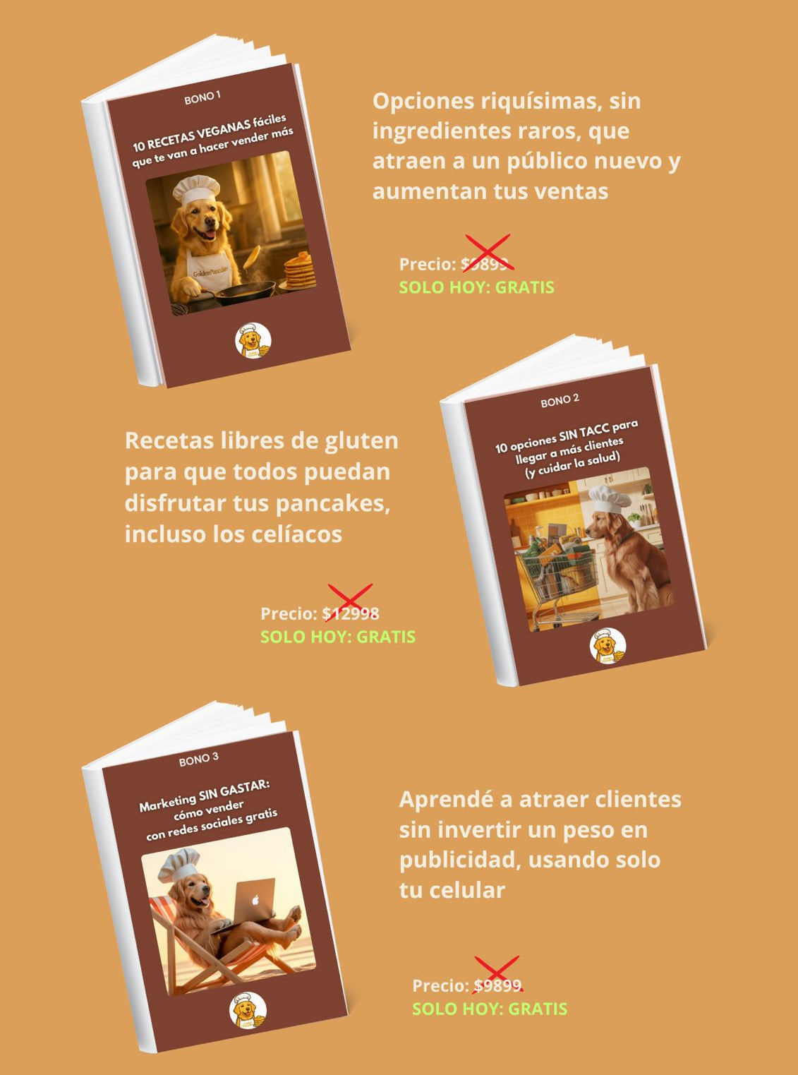 Incluye la receta original de GoldenPancakes™, más de 100 recetas extra, guías prácticas, ejemplos reales y 15 bonos premium que te ayudan a vender, escalar y mejorar tus resultados.